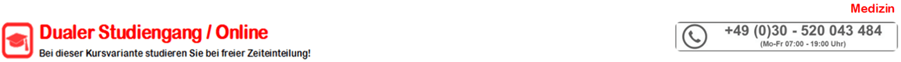 Der Duale Studiengang  richtet sich an Interessenten, die keinen Abschluss haben bzw. sich auf ein Studium im Bereich Medizin vorbereiten oder sich zu dem erworbenen Abschluss fortbilden wollen. Mit diesem Studiengang eignet sich der Kursteilnehmer Fachwissen im Bereich der Medizin an bzw. um erfolgreich im Berufsalltag zu sein (...)