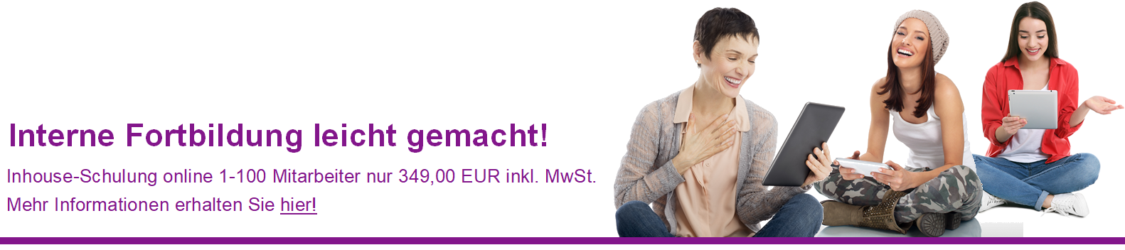 Die betriebliche Inhouse-Schulung ist eine Online-Veranstaltung. Bei diesem internen Fortbildungsprogramm hat jede/r Mitarbeiter/in die Möglichkeit, innerhalb von 90 Tagen nach Freischaltung des eCampus-Accounts bei freier Zeiteinteilung an der internen Schulung teilzunehmen und den Videobeitrag jederzeit abzurufen.