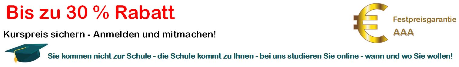 Ein Fernkurs ist ein bis zu 100 Prozent gestützter Onlinekurs. Hier studiert der Kursteilnehmer bei freier Zeiteinteilung von zu Hause aus. An unserer Bildungseinrichtung ist die Studienlaufzeit bei dieser Kursvariante variabel (minimale / maximale Studienlaufzeit). Der Studierende legt die Studienlaufzeit und das Tempo selbst fest. Die minimale Studienlaufzeit ist die Regelstudienzeit und ergibt sich aus der jeweiligen Stundenanzahl des gebuchten Kurses. Die Differenz zwischen minimaler und maximaler Studienlaufzeit ist gebührenfrei und kann vom Studierenden selbstständig festgelegt werden.